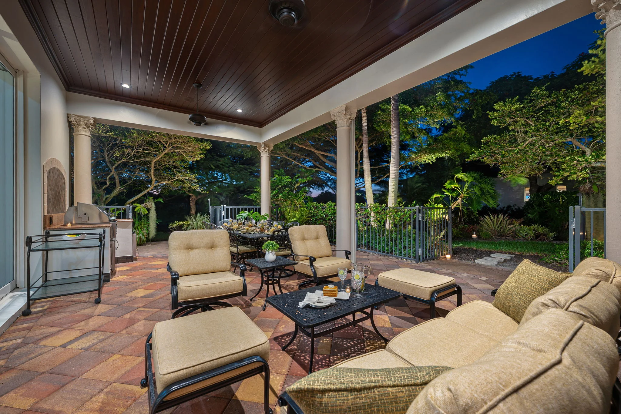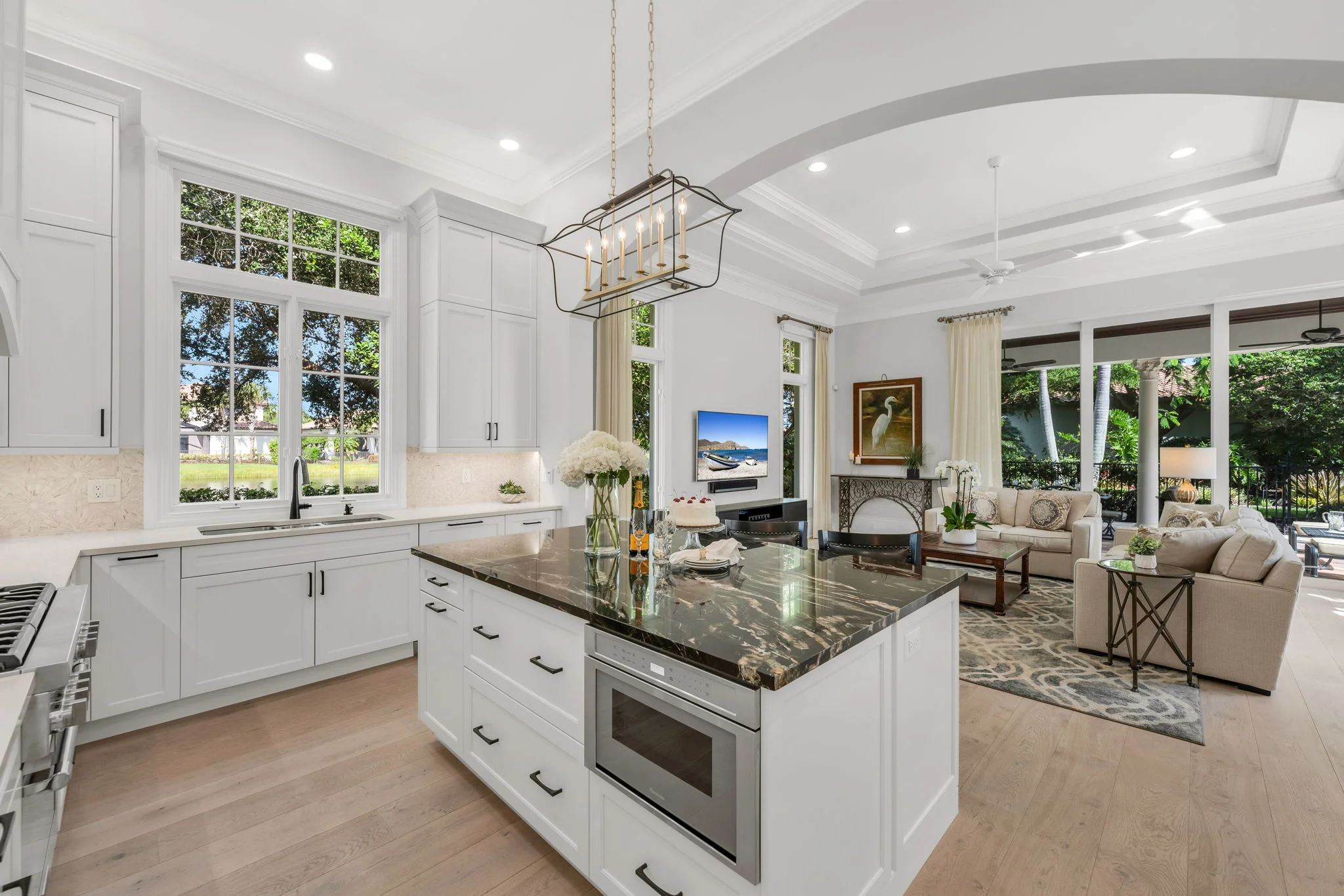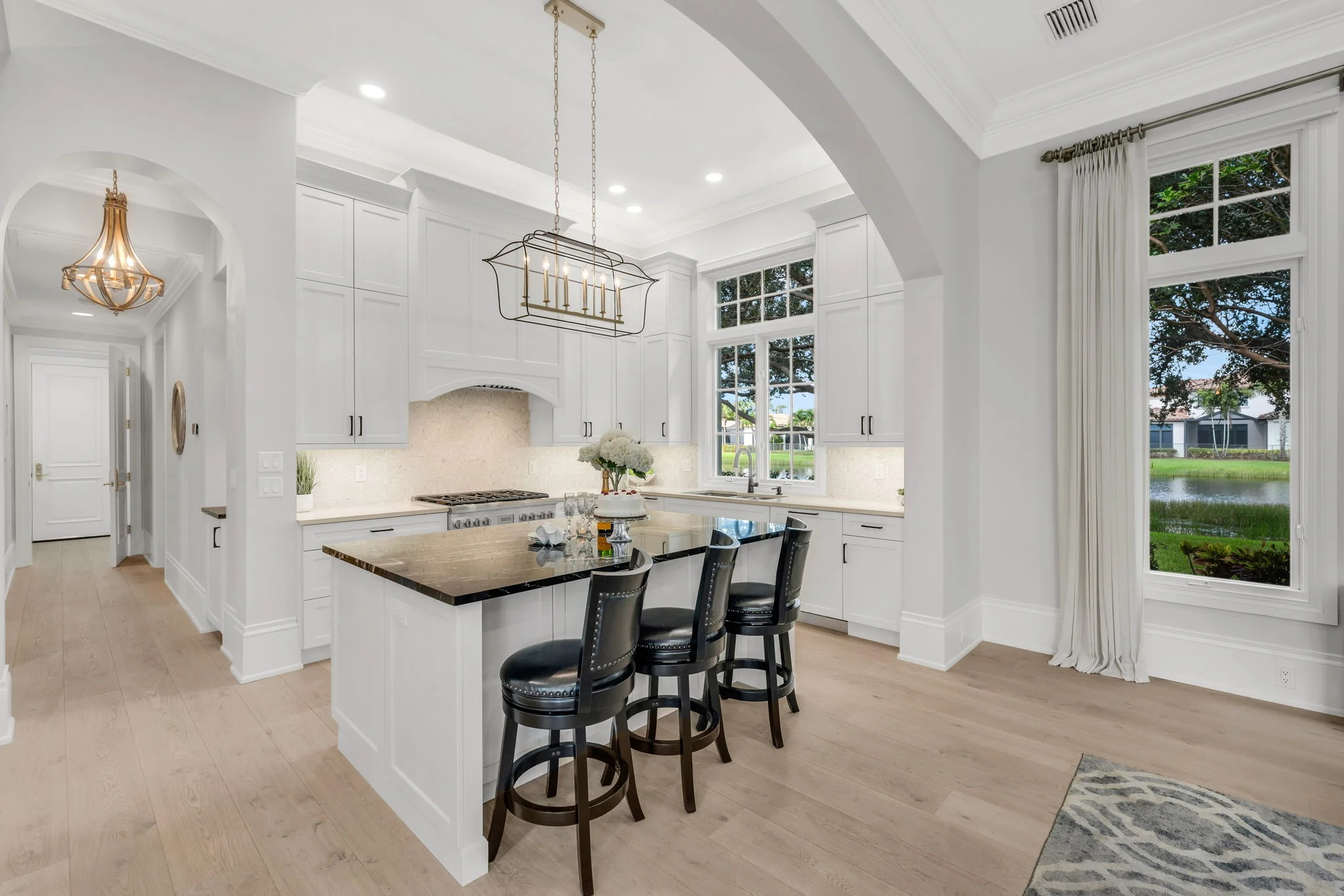 Perfectly positioned on one of the most desirable homesites in Grey Oaks’ sought-after Torino enclave, this elegant two-story residence captures the essence of refined Naples living. Set on a rare corner lot surrounded by lush tropical landscaping, the home enjoys panoramic lake views and a private, garden-like setting that feels both serene and secluded—yet just moments from the heart of the Club. Built in 2007 and thoughtfully transformed with timeless updates, this 3,950-square-foot residence (4,922 total) offers an ideal balance of sophistication and comfort. The open layout includes 4 bedrooms plus an office, and 4 full + 1 half baths, blending indoor elegance with effortless outdoor living. Wide-plank white oak floors lend warmth and texture to the main living areas and the first-floor primary suite, while walls of glass fill the interiors with natural light and frame views of water, sky, and lush greenery. At the heart of the home, a stunning remodeled kitchen showcases sleek cabinetry, designer lighting, and professional-grade appliances. The large island invites gathering with family and friends, while the adjacent dining and living spaces flow naturally to the lanai—where everyday moments transform into something extraordinary. Step outside, and the lanai opens to what feels like your own private botanical garden: a tranquil oasis where colorful blooms and graceful palms sway in the breeze, mirrored in the calm waters of the lake beyond. It’s a setting that invites morning coffee al fresco, sunset cocktails with friends, or quiet reflection surrounded by nature’s beauty. The spacious primary suite offers a private retreat with tranquil garden views, dual closets, and a spa-inspired bath designed for relaxation. Three generous guest suites—two upstairs and one on the main level—ensure that family and guests enjoy comfort and privacy. Additional highlights include impact-resistant windows and doors throughout, natural gas, and a two-car attached garage with the opportunity to add a golf cart garage to the front office. Every element of this residence was designed for ease, elegance, and connection to its surroundings. Living in Grey Oaks means enjoying world-class amenities, including three championship golf courses, an elegant clubhouse, resort-style pool, tennis, pickleball, and a state-of-the-art wellness center—set within a lush, guard-gated community just minutes from Naples’ white-sand beaches and Fifth Avenue’s fine dining and boutiques. This remarkable Torino residence represents more than a home—it’s a private sanctuary where architecture, nature, and lifestyle come together in perfect harmony. Experience the beauty, tranquility, and prestige of Grey Oaks living at its finest.