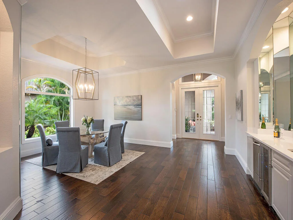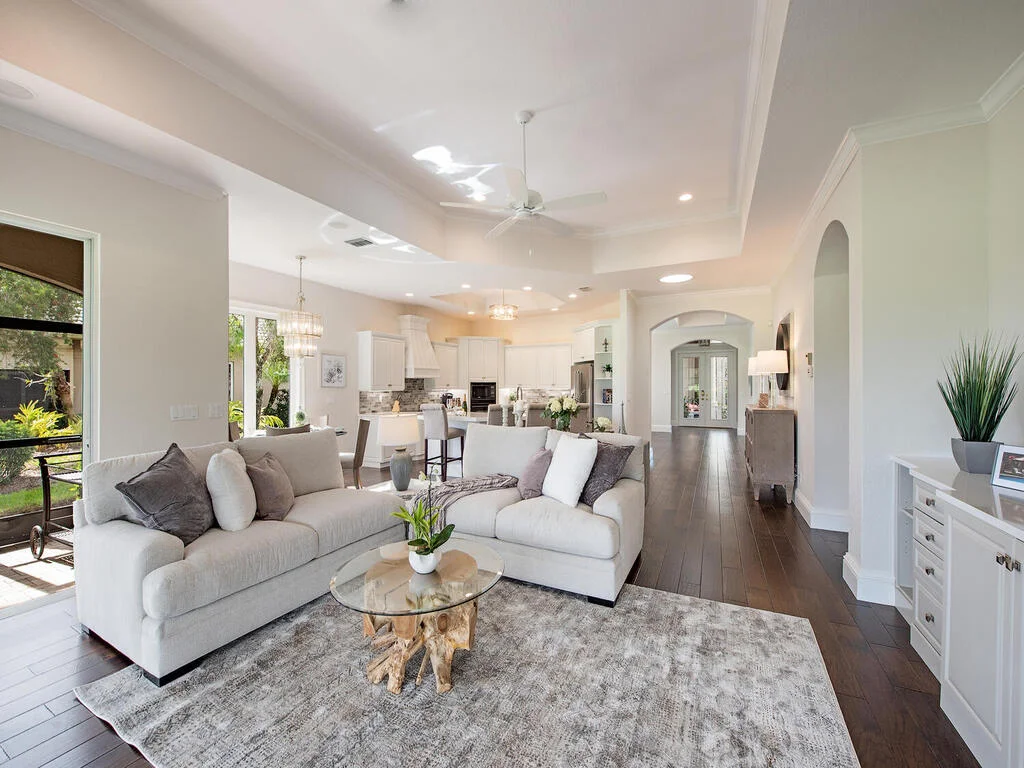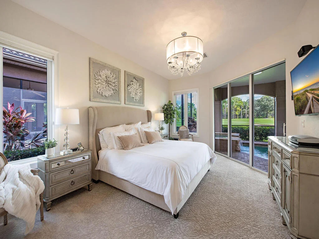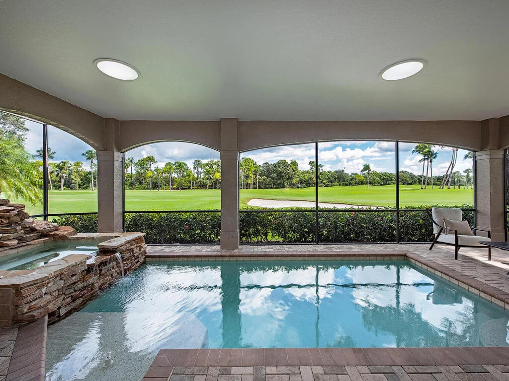 Spectacular, panoramic golf course views and beautifully updated, coastal interiors throughout this furnished residence, will make it very easy to begin living the luxury lifestyle that Grey Oaks has to offer Enjoy incredible golf views from almost every room in the home, furnished with a casual, chic, coastal flair, including quartz countertops in large-island kitchen and all bathrooms, new light fixtures and LED throughout, completely repainted interiors in soft, inviting coastal hues This villa has 12' coffered ceilings, with spacious rooms, open concept floor plan, with retracting, and sliding glass doors that open to your outdoor oasis: sip your coffee in the phenomenal rock spa, while your guests frolic in the pool, and take in the private, peaceful views