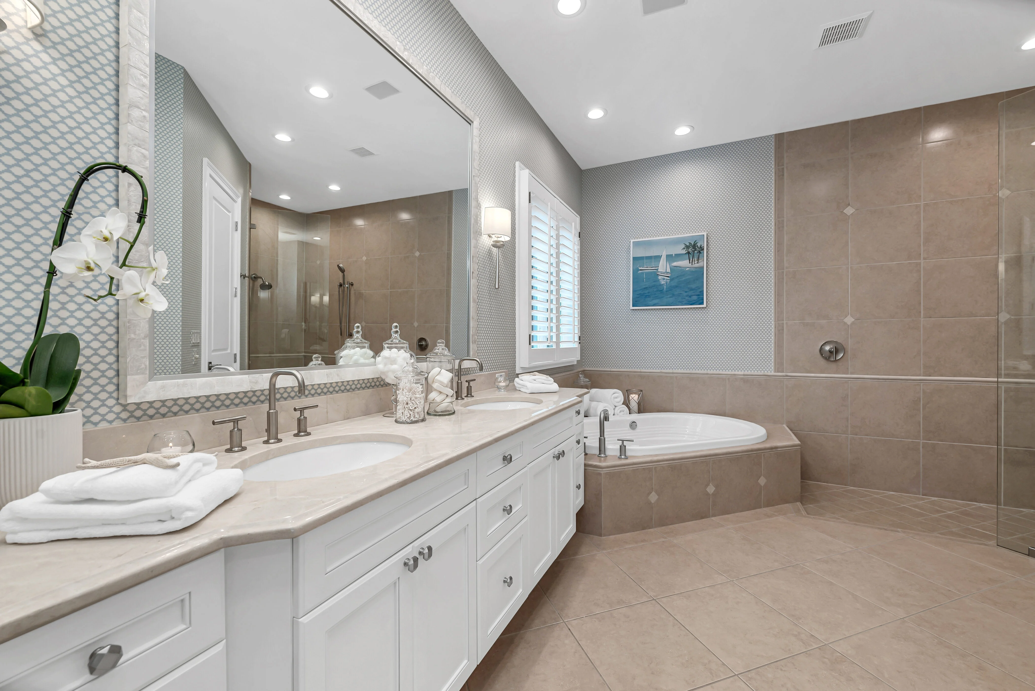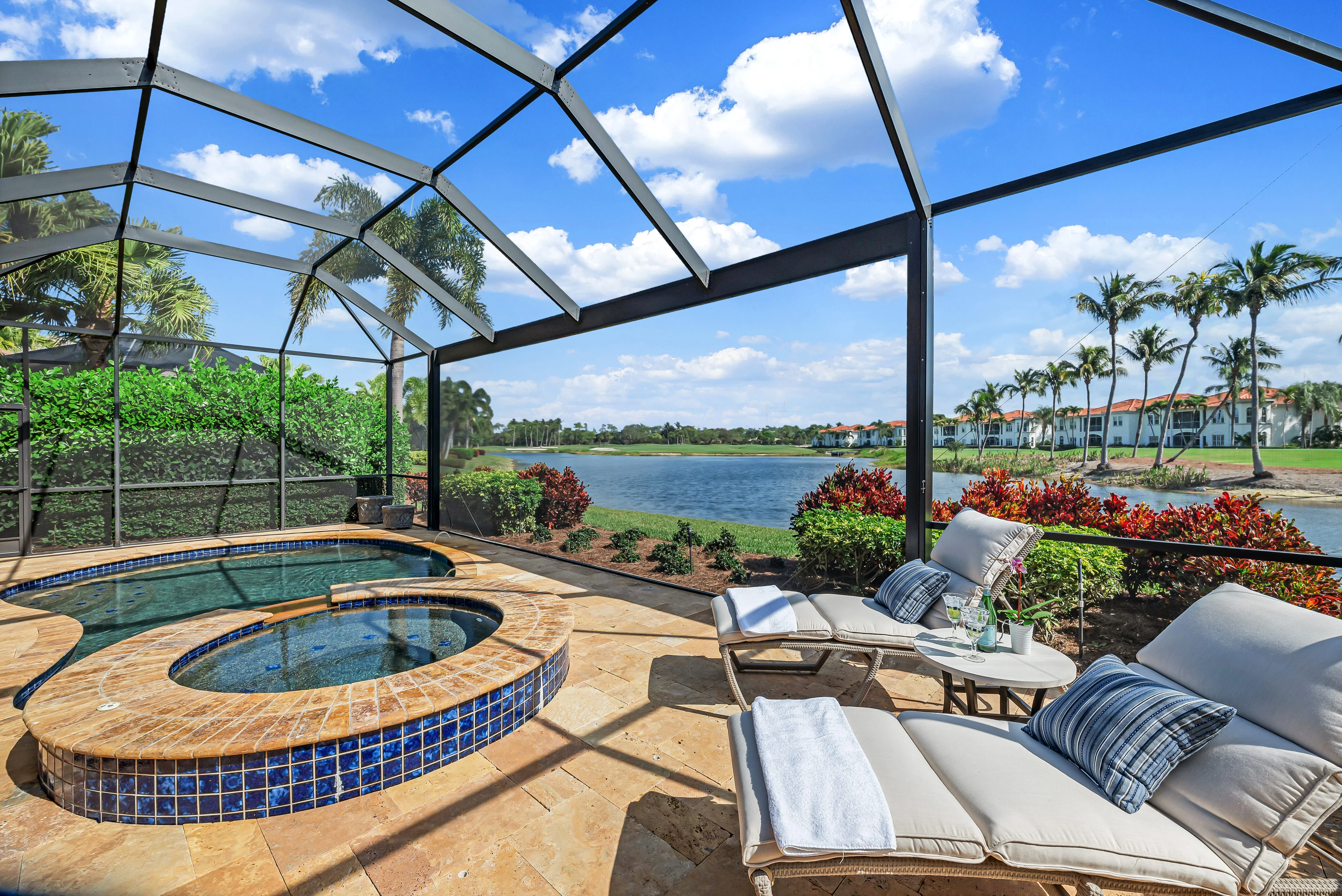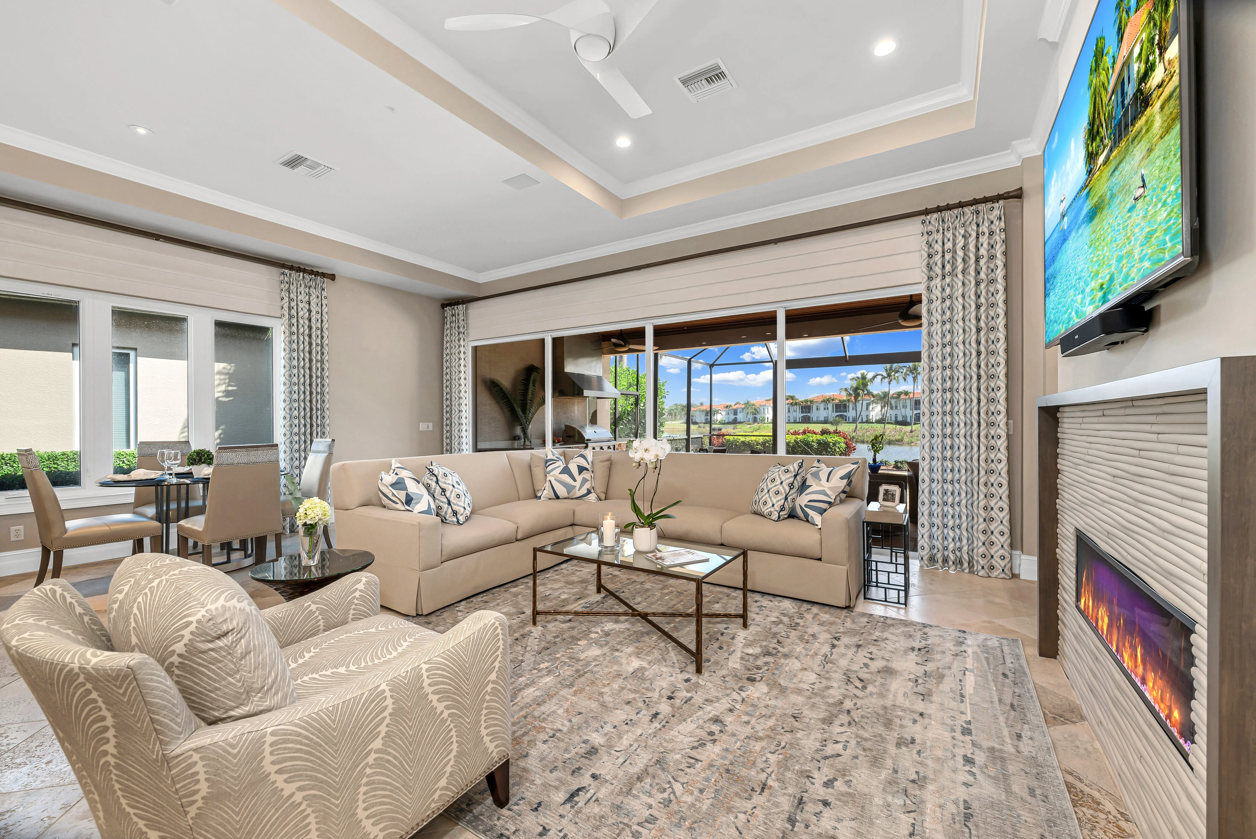Classic light, stone flooring, open-concept, gourmet kitchen with abundant cabinetry, new island, quartz counters, new tile backsplash, enhanced with SubZero, Wolf and Miele appliances Custom, new bar with wine cabinets, beverage refrigerator, completely renovated gas fireplace, custom cabinetry/shelves, and complete new guest bath Wellness Center, Pool Café, resort pool, three golf courses, and conveniently located in the center of Naples, minutes from the beach, downtown, shopping and restaurants